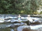 My son, his dog and his friend, me my Pyr and Pom went down the ext ladder to the river below me. OMG you guys from up here it looks like nothing. Down there, it is HUGE. I mean dangerous! crevaces how do you spell that? If you fell you could get wedged in one! River is super strong. HUGE swimming holes under overhanging rock with green green green things hanging on them everywhere!.