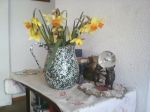 tory is the horse. The gal tried to help her but its too much. So she is mine. Dickens the pot belly pig is who is all twisted up like a burrito in his tarp....flowers from the pasture, Milly and ruby in pooty pants. Can you believe this crazy piglet nursing on this poor cow! Now she has mastitis so I have to give her injections every day. Needless to say she will never like me! She has not gotten her mom pig and the two piglets here yet. Hoping she can sell them asap.