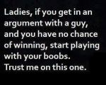 Playing with your boobs would not work on me. If it's a gay guy and you want to win the argument, complimen his shoes, fashion sense, or accessorizing abilities....or say "that guy was just checking you out" and he will forget about the argument and you will win by default.