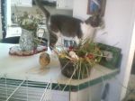 cat I placed bowl of grasses for my skinny pigs,roses and fresh eggs