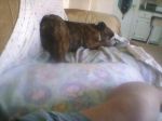 Augie my pet farm pig has decided he has to get in my lap....He leans on me, slides down and pins me by my feet! geez